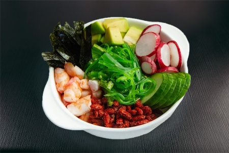 Креветки, авокадо, ягоды годжи, чука, редис, огурец, водоросли нори, рис,
