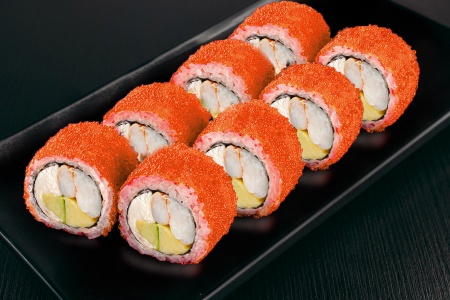 Рис, нори,тобико оранж,креветка тигровая, капуста пекинская,спайси соус.